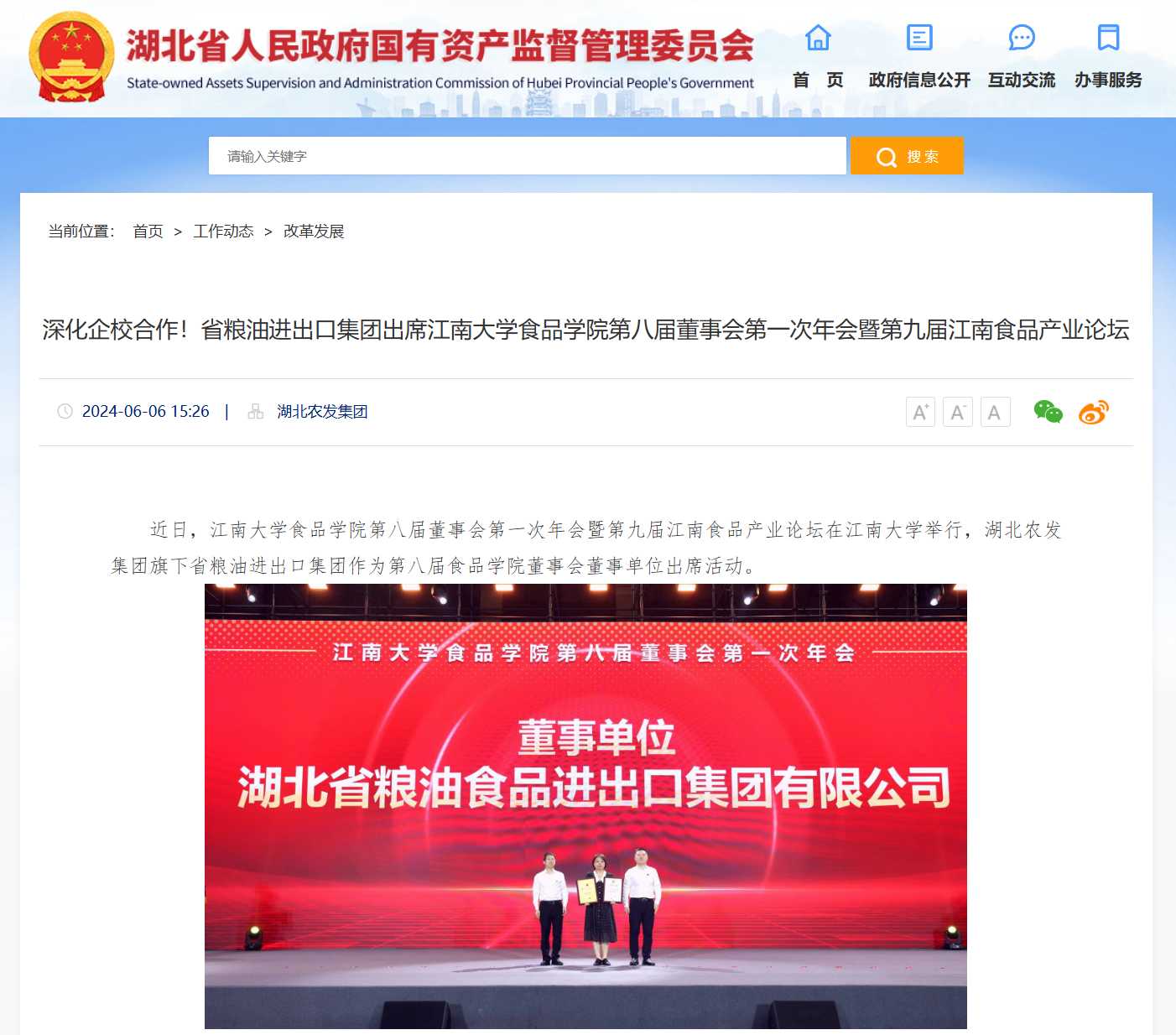 湖北省國資委:深化企校合作!省糧油進出口集團出席江南大學食品學院第八屆董事會第一次年會暨第九屆江南食品產業論壇